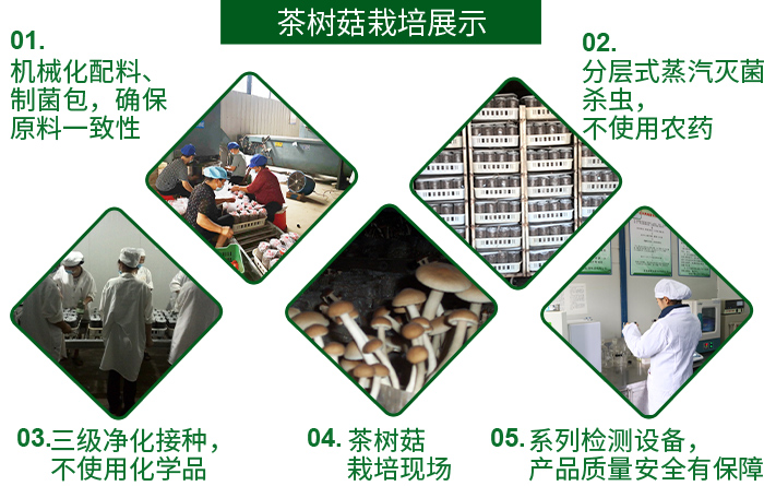 湘蕈茶树菇从栽培原料检测入库、鲜菇采收、修脚、脱水烘干、包装、出厂检测,到运输配送,注重每一个环节,确保产品质量全。