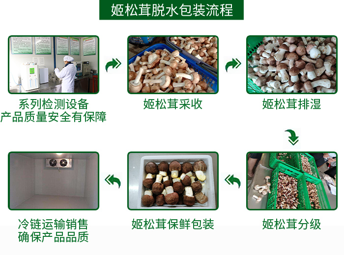 姬松茸鲜货经低温排湿后,保鲜包装,低温冷链储运,防腐烂霉变、保质期